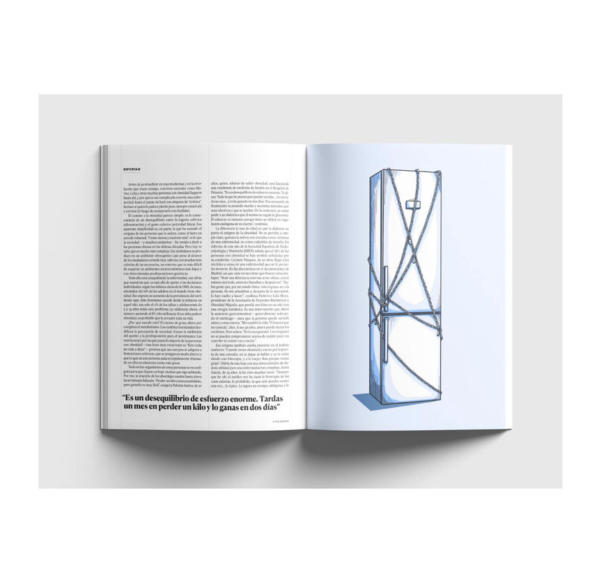Editorial illustrations for the article The uncertain revolution against obesity (La incierta revolución contra la obesidad) by Pablo Linde for El País Semanal, regarding Ozempic, fatphobia and social implications of the new use of these drugs. Final project (thesis) for my MA in Editorial and Publicity Illustration.